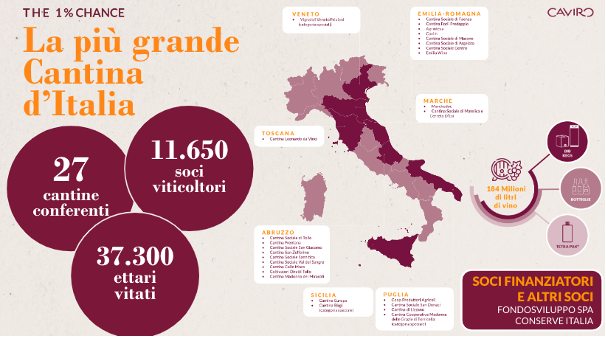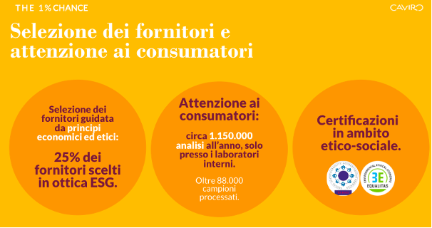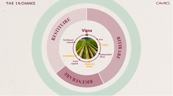 Il Gruppo processa ogni anno 624.000 tonnellate di scarti: oltre il 99% di questi trova nuova vita e solo lo 0.1% viene inviato a smaltimento. Con quel 99%, CAVIRO dimostra di saper costruire progetti concreti, riassunti nel Bilancio di Sostenibilità, ma punta a concentrarsi sull’1% che rimane – THE 1% CHANCE – che rappresentaun’opportunità: lo slancio verso il miglioramento e il progresso, la spinta a darsi da fare, a “rimboccarsi le maniche”, pervasi da un sentimento di urgenza e consapevoli che non c’è più tempo da perdere, lavorando a progetti in cui l’innovazione e la ricerca sono strumenti necessari per consegnare il Pianeta nelle mani di chi verrà dopo.